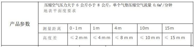 氣浮平板搬運車特別適用于不能承受震動、無塵環境、對平穩性要求很高的重物的搬運與就位,以及一些在特殊情況下不能進行常規吊裝、移運的場合下搬運。氣墊平板搬運車對地面的要求如下: