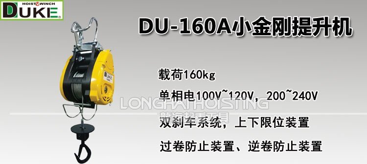 ? 煙臺開發區龍海起重工具有限公司銷售臺灣DUKE小金剛提升機:DU-160A小金剛提升機,載荷160kg,外型小巧,重量輕,凡起重、揚升、拖拉等作業皆適宜,省時省力效率高。